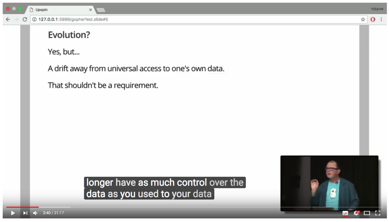 "the cloud? a drift away from universal access to one's own data" i liked this talk of Rob Pike on https://upspin.io https://youtu.be/ENLWEfi0Tkg