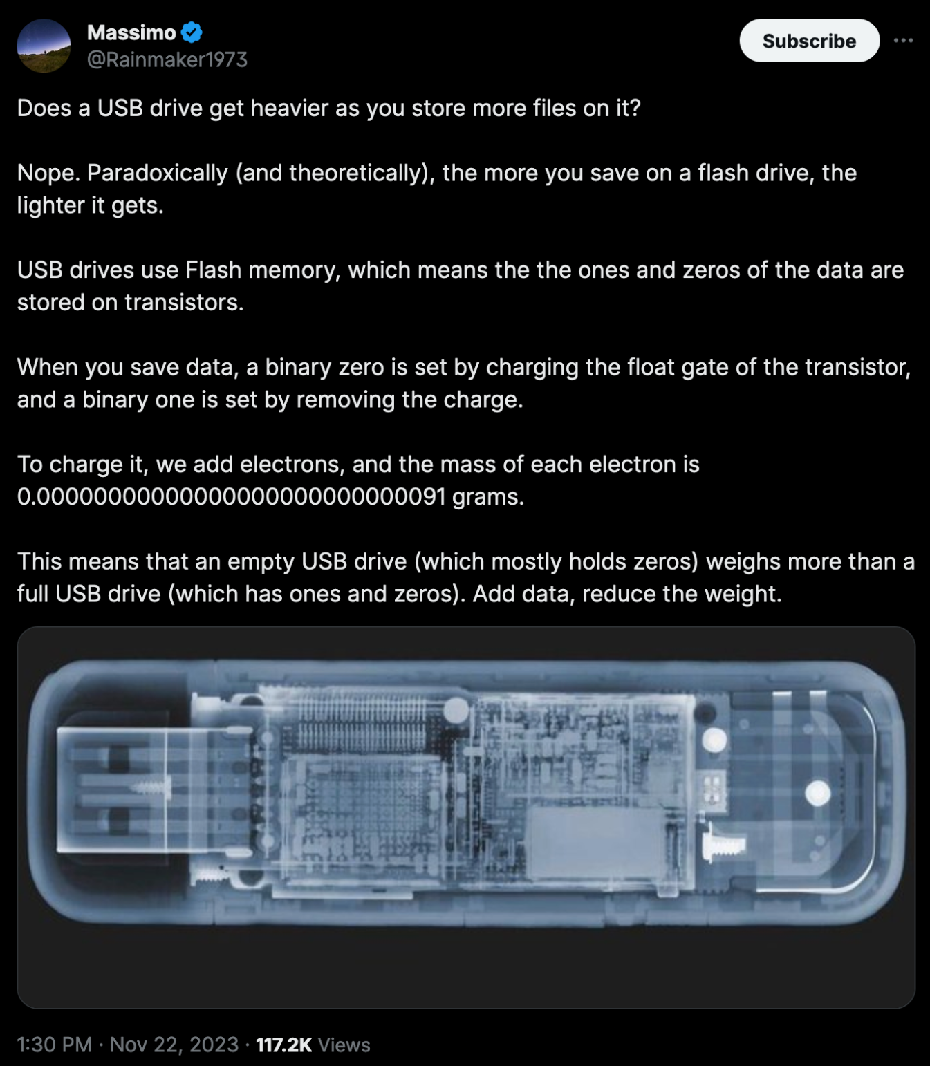 TIL "an empty USB drive (which mostly holds zeros) weighs more than a full USB drive (which has ones and zeros). Add data, reduce the weight." 🤯